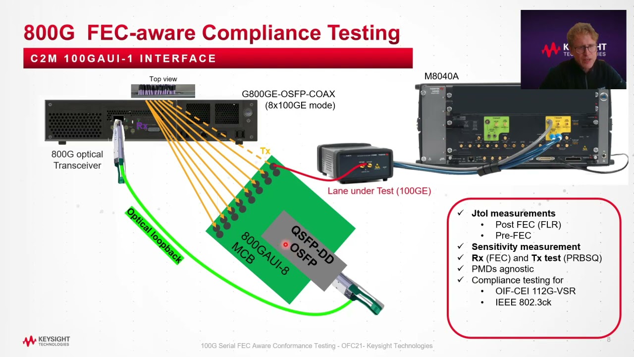 Keysight will demo a physical design validation solution for 800G components and transceivers. 100G electrical interfaces such as those defined by the IEEE 802.3ck and OIF-CEI 112G standardization bodies are the workhorse of next generation datacenter. Because 53Gbaud PAM4 interface design margins are shrinking, the need for accurate in-depth design validation has increased tremendously. The solution consists of the M8040A BERT, combined with the G800GE multichannel tester. It is designed to integrate FEC constraints into the physical design validation and compliance testing.