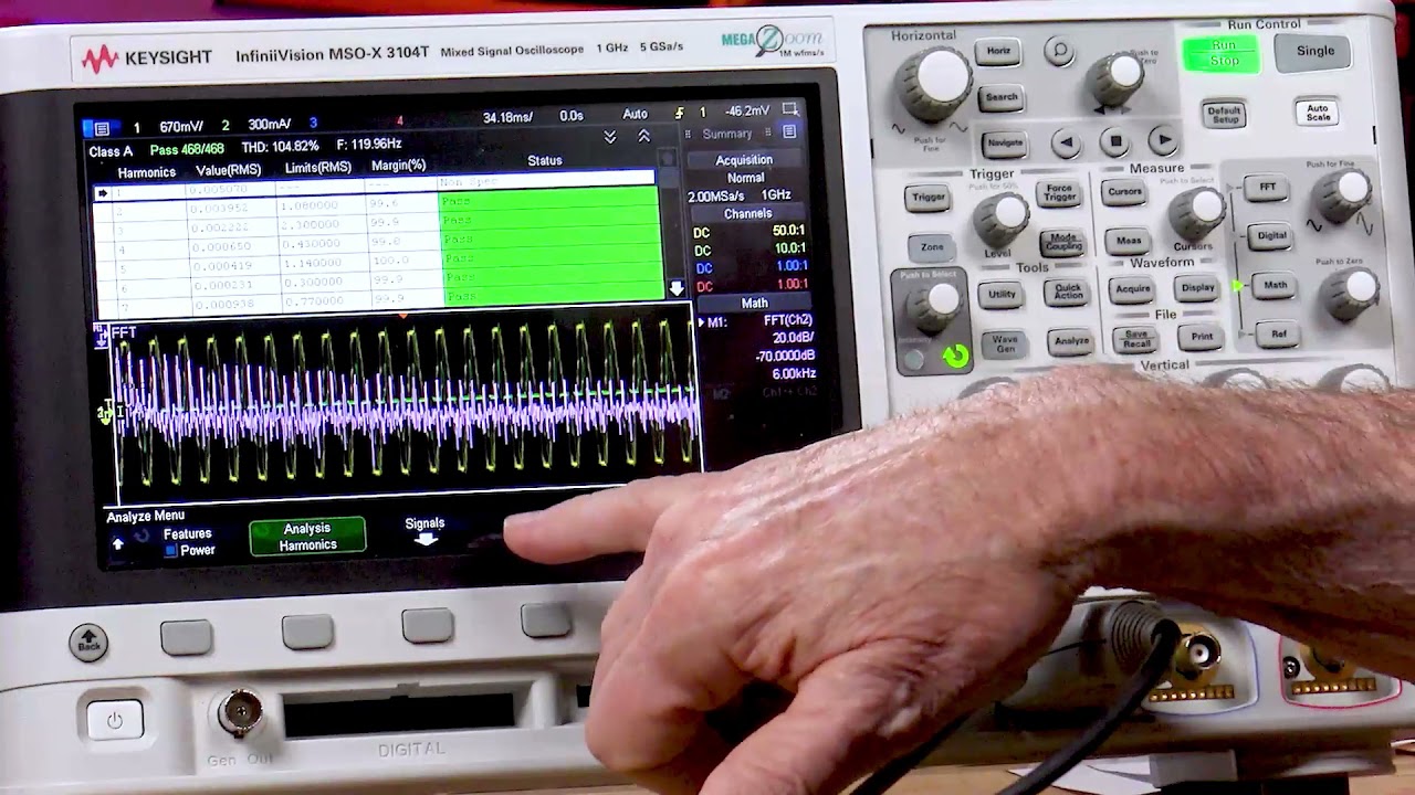まず一般的なAC/DC電源に高電圧プローブと電流プローブを接続して力率や有効電力などの電源品質パラメータの自動測定の方法やAC電源ラインに高調波を注入して他の機器に影響を与えないように規定されているIEC610000-3-2のコンプライアンステストのPass/failテスト、DC/DCコンバータのフィードバック回路の安定性を評価するための制御ループの応答テストも実際に入出力の信号をモニタしながら位相や利得のプロットを読み解きます。